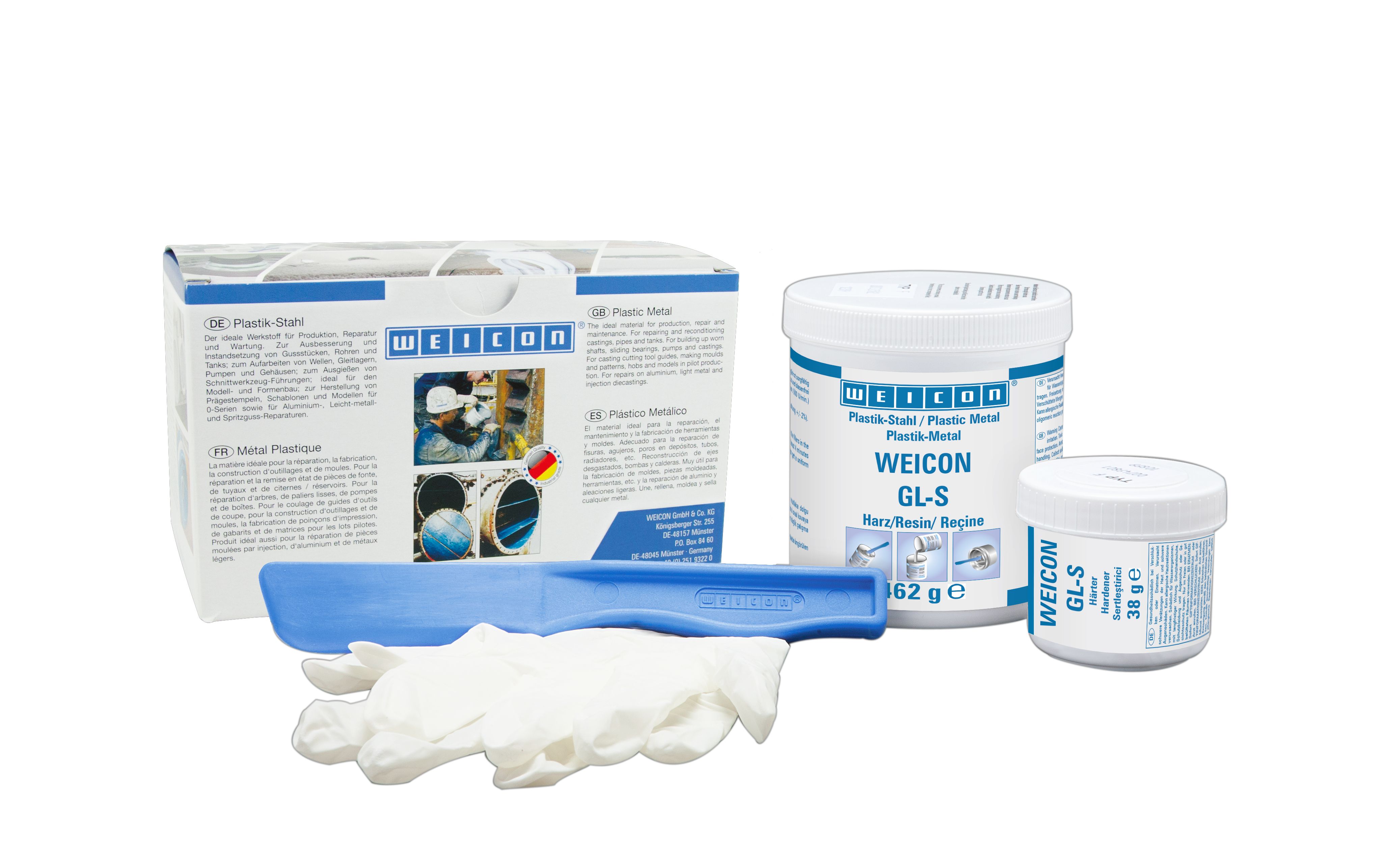 The Plastic Metal type WEICON GL-S provides high abrasion resistance and serves as wear protection for heavily used surfaces in industrial applications. The epoxy resin system is flowable and spreadable and can be applied with a paint brush. It shows high adhesive strength, is mineral-filled, chemical-resistant, and temperature-resistant up to +180 °C.