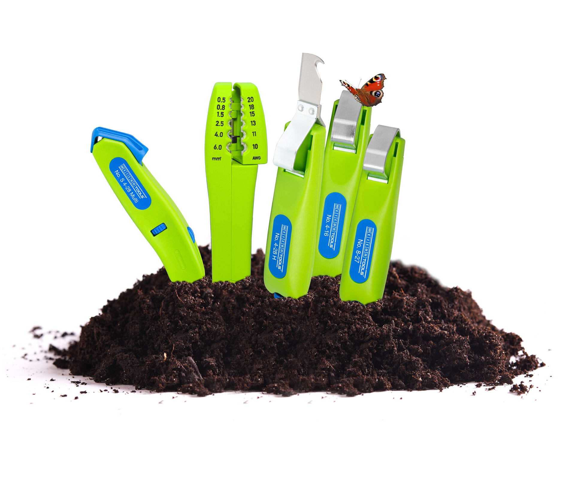 Just like the classic line in blue, the Green Line tools, which were developed in cooperation with experts, include various cable knives, wire strippers, cable strippers and multi-purpose strippers. In total, the Green Line features fourteen different tools.